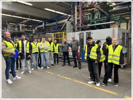 Den Schüler*innen wurden anschaulich die einzelnen Fertigungsschritte erklärt – von der Rohstoffanlieferung bis zur Qualitätskontrolle. Dabei wurde auch deutlich, welche Bedeutung Nachhaltigkeit und Recycling in der Kunststoffproduktion spielen.