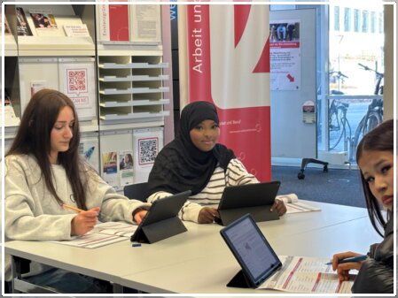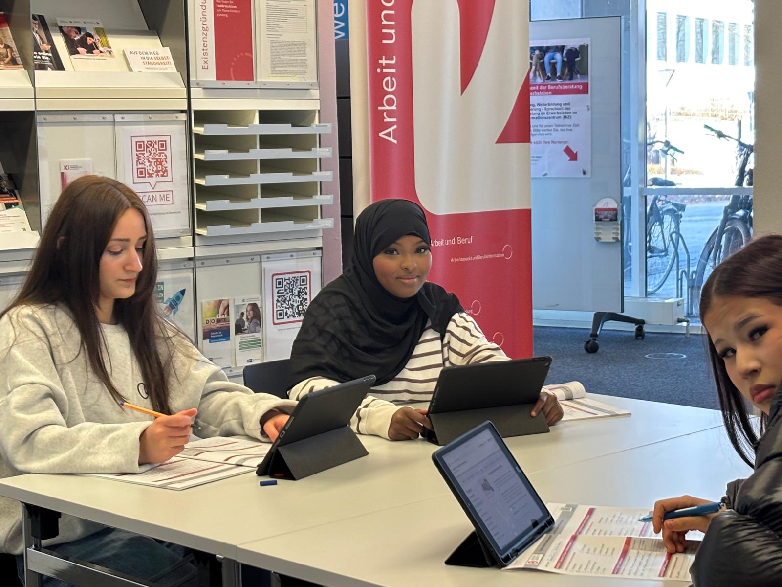 Nach der Ankunft im Berufsinformationszentrum wurden die Schülerinnen und Schüler von Frau Rosetti von der Agentur für Arbeit begrüßt. In einer anschaulichen Präsentation erhielten sie zunächst einen Überblick über die vielfältigen Angebote des BIZ. Dabei wurde erklärt, wie man Informationsmaterial zu verschiedenen Berufsfeldern findet, Online-Tests zur Berufsorientierung nutzt und individuelle Beratungsgespräche vereinbart.