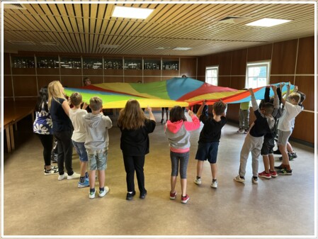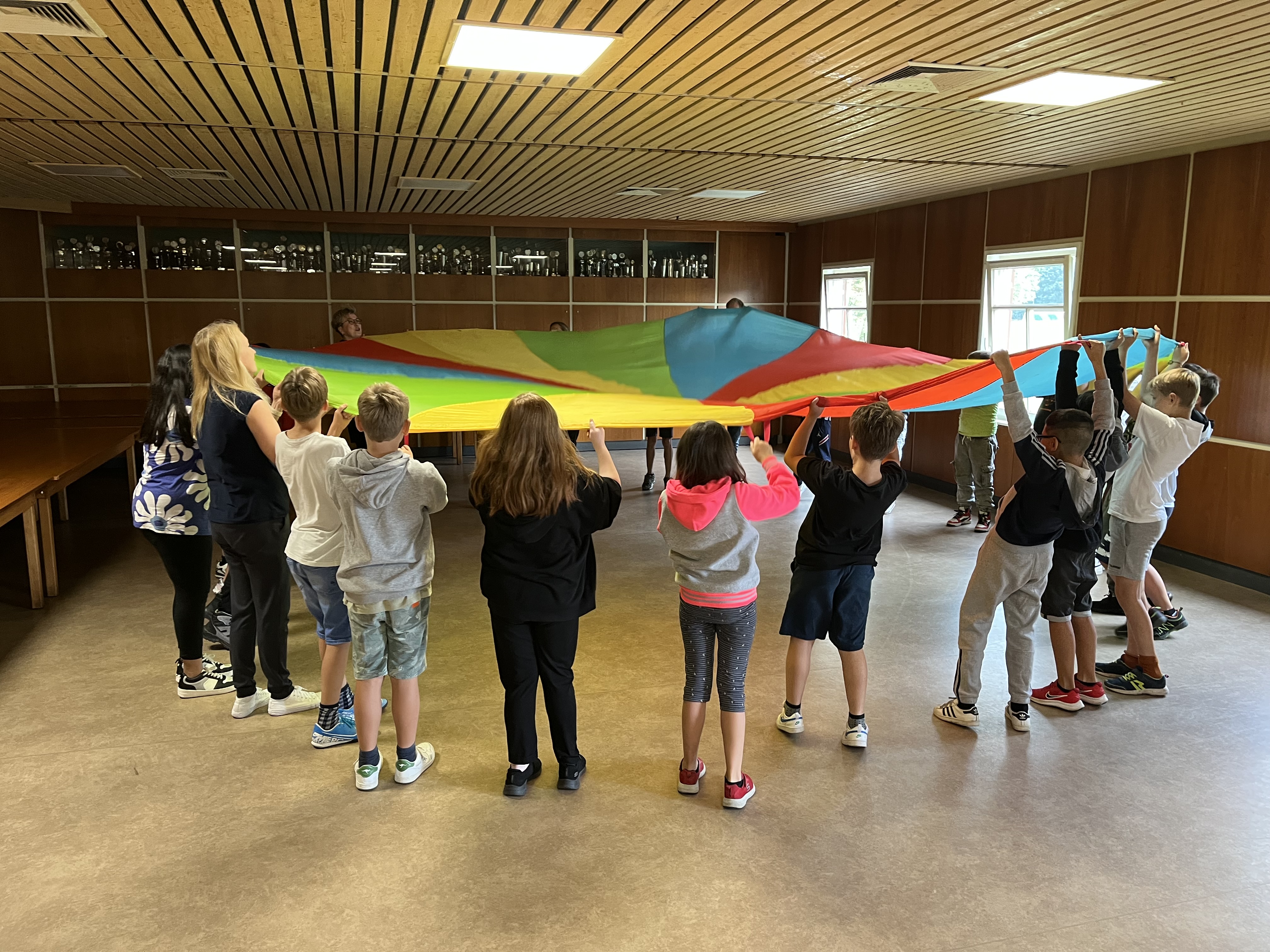 Bei schönstem Wetter konnten die Schülerinnen und Schüler unter anderem im Team mit dem Rollbrett einen Parcours abfahren, den Ball mit allen im Schwungtuch halten, danach diesen auf dem Feld ins Tor befördern und zwischendurch den Hunger und Durst beim gemütlichen Zusammensitzen stillen.
