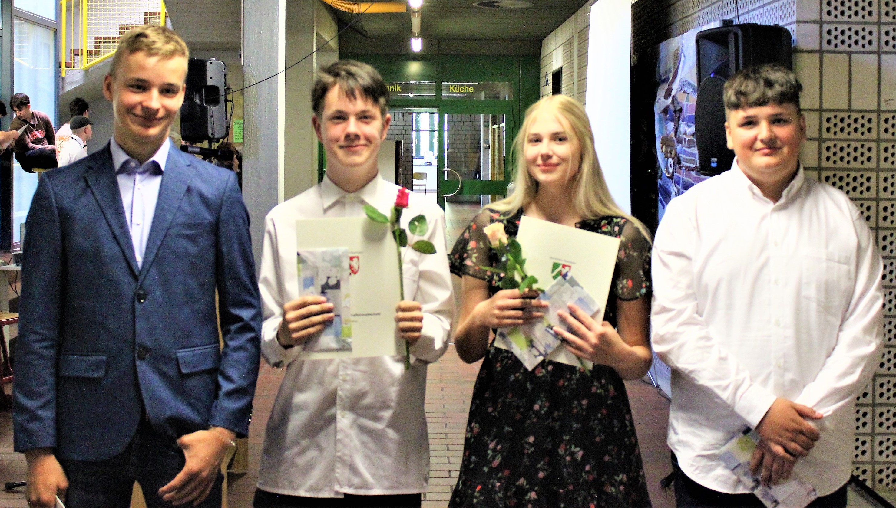 Nach Vergabe aller Abschlusszeugnisse fand auch in diesem Jahr wieder eine Tradition statt: Die Auszeichnung des besten Schülers oder der besten Schülerin in den Klassen 10A und 10B. Erreicht haben diese Auszeichnung in diesem Jahr vier Schülerinnen und Schüler: Ben Holtmannspötter, Felix Neeb, Janna Huwe und Dennis Marques. Herzlichen Glückwunsch zu dieser besonderen Leistung.