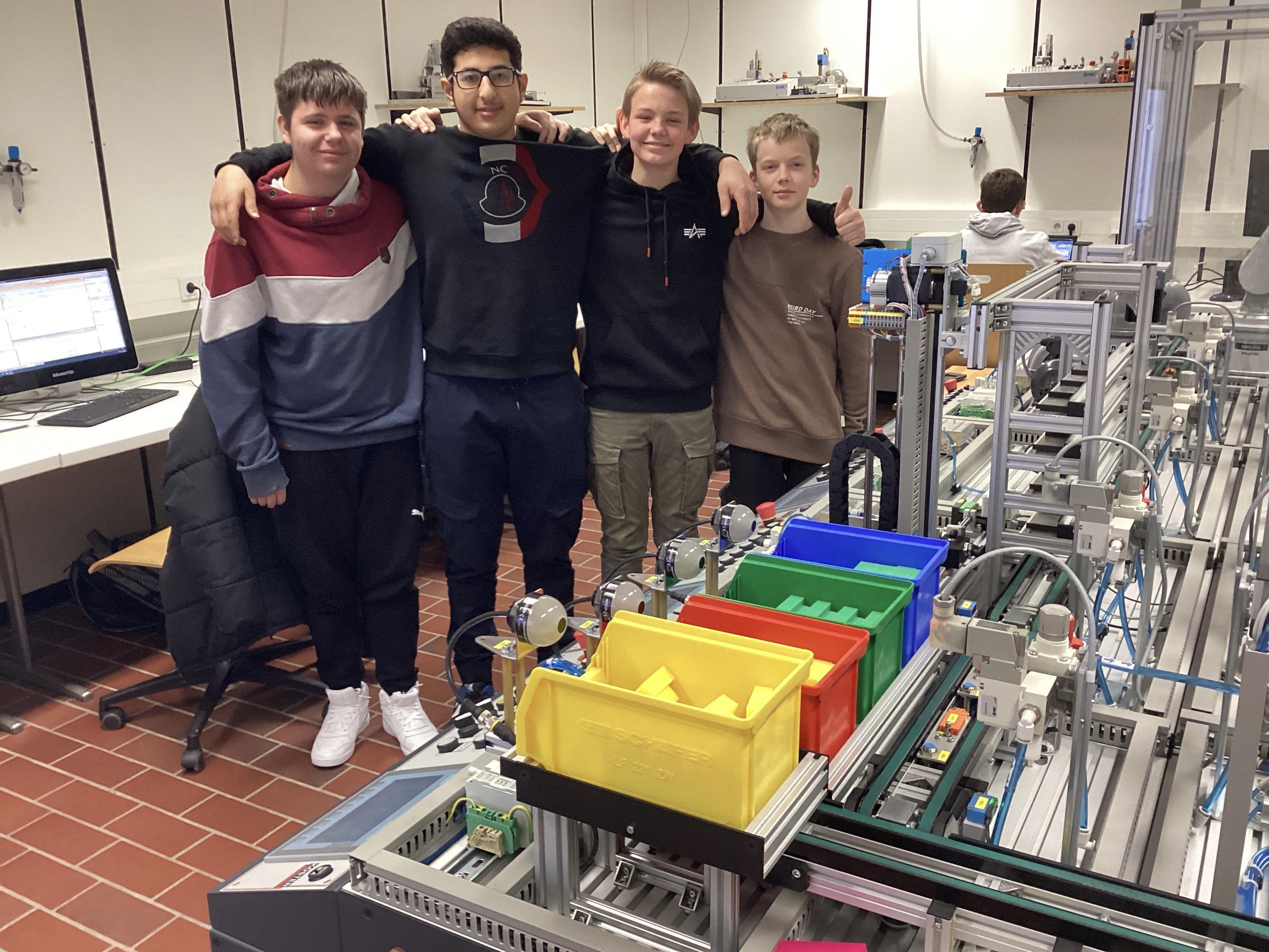 Stichwort Zukunft: Im Labor „Industrie 4.0-Anlage“ lernten die MINT-Schülerinnen und Schüler am Modell kennen, wie künftig in der Industrie gearbeitet wird. Hier waren Nick Frenking, Malik Jaba, Julius Stegemann und Lennox Mooser aus der 8a so begeistert, dass sie vor der Anlage gleich mal für ein schönes Foto Modell standen…