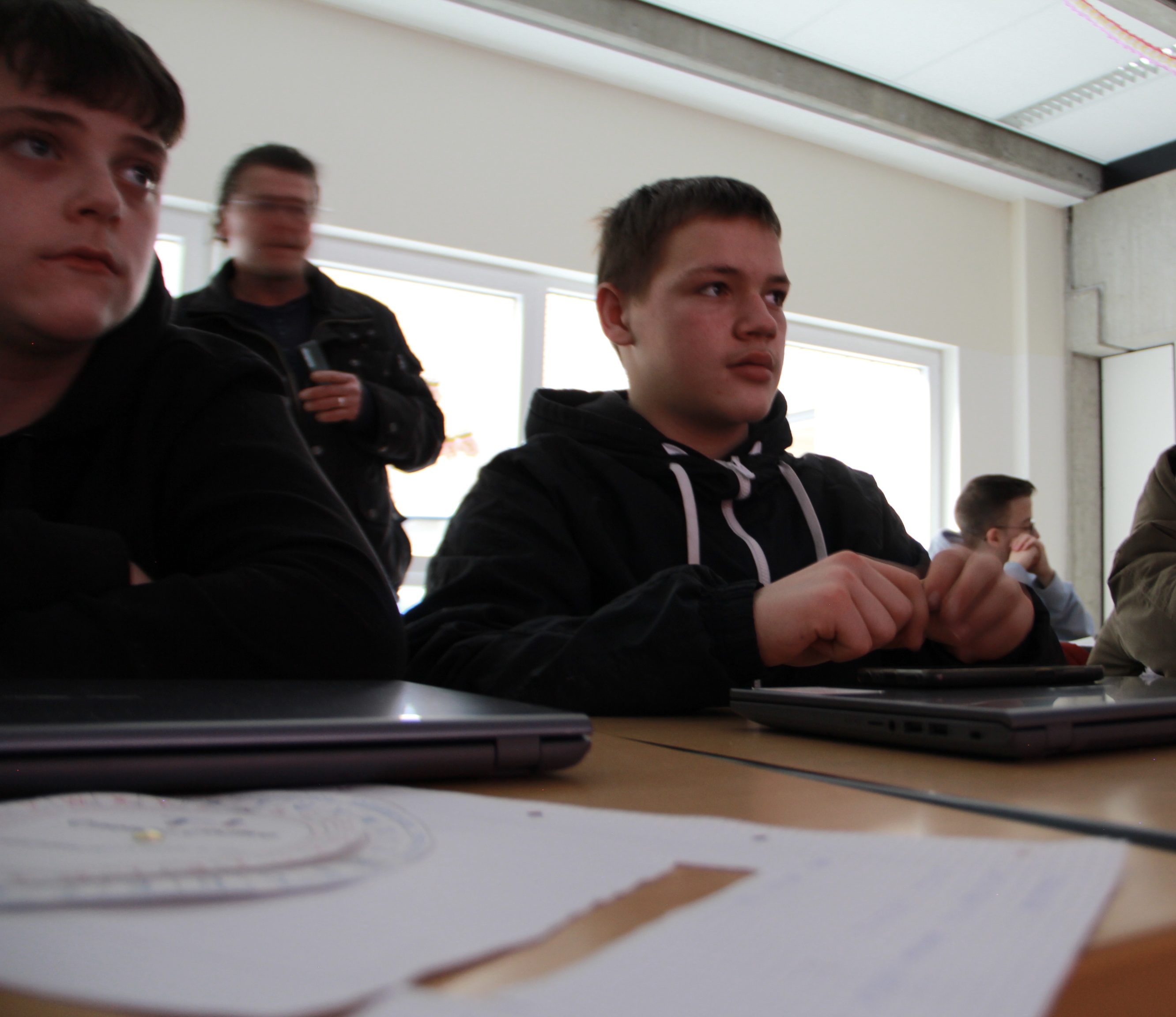 Noah Schrick (links) und Robin Beuning aus der Klasse 8b als aufmerksame Zuhörer beim MINT-Tag an den Technischen Schulen Steinfurt. [Foto: TSST]