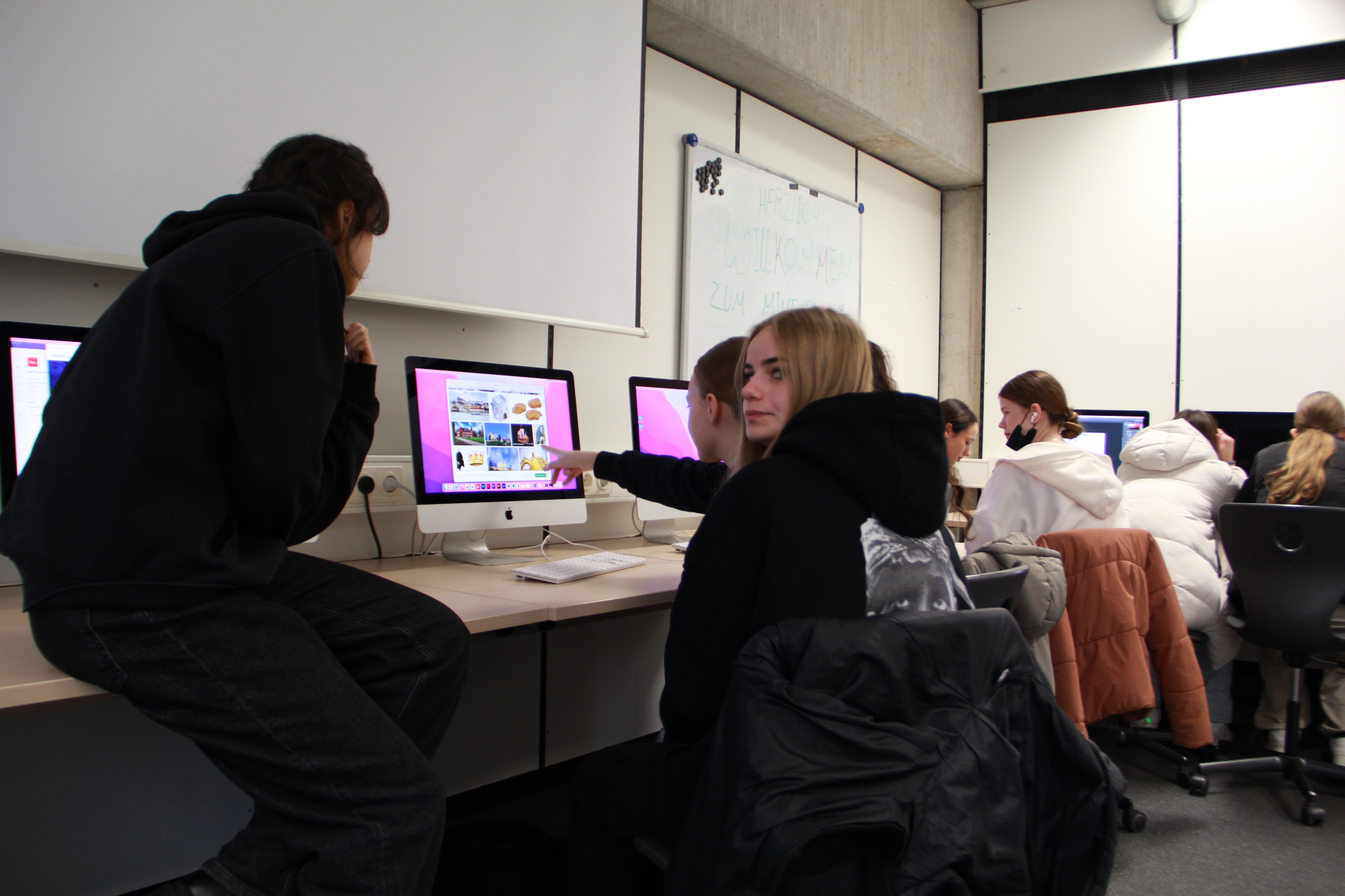Bildbearbeitung am Rechner im Gestaltungslabor an den Technischen Schulen: Maren Hoffstedde (r.) und Lilly Wessel aus der 8a. [Foto: TSST]